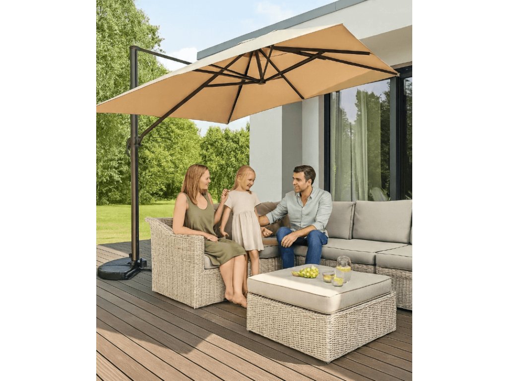 Veľká tieniaca plocha 300 cm – ideálna pre celú rodinu alebo skupinu hostí.